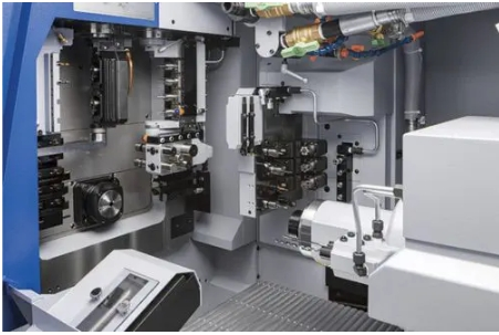 双 B 轴可编程装置:B1 轴 - 4 轴铣削单元,行程 135°,可同时进行 5 轴控制编程;B2 轴 - 为各种刀具单元提供相同的功能,包括业界首创的双螺纹旋转单元,该单元配有制动器,可在加工时保持刚性。