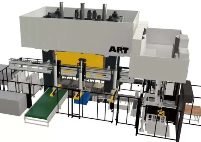 AP&T伺服压力机生产线的3D可视化效果图,其特色为一台带全伺服液压垫的1,500吨伺服压力机、集成板料拆垛机、三台AP&T SpeedFeeder®单元以及自动化堆垛,布局紧凑高效