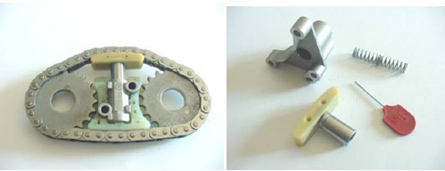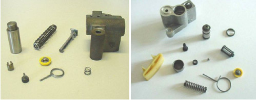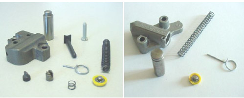 汽车液压张紧器装配测试线需要装配的零件,包括壳休、轴套、活塞、弹簧、通风盘、止回阀、棘轮夹、固定销子。