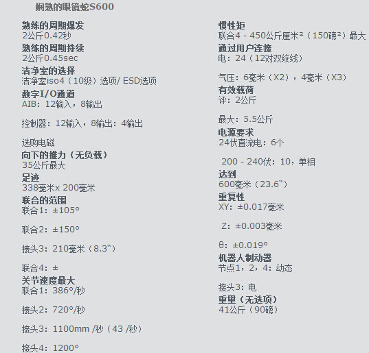 娴熟的眼镜蛇S600 SCARA机器人(4轴机器人)是一种高性能的SCARA机器人系统的机械装配,材料处理,包装,机器抚育,螺杆驱动,和其他应用程序需要快速和精确的自动化。娴熟的眼镜蛇系列机器人包括娴熟的smartcontroller运动控制器,它提供了业界无可比拟的性能。