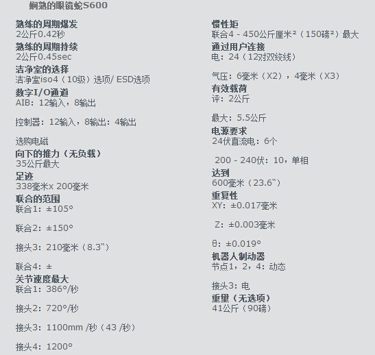 娴熟的眼镜蛇S600 SCARA机器人(4轴机器人)是一种高性能的SCARA机器人系统的机械装配,材料处理,包装,机器抚育,螺杆驱动,和其他应用程序需要快速和精确的自动化。娴熟的眼镜蛇系列机器人包括娴熟的smartcontroller运动控制器,它提供了业界无可比拟的性能。