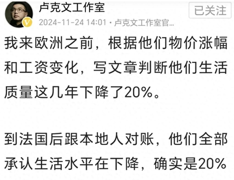 卢克文:到欧洲坐实了欧洲人生活水平下降20%,5年后还要再下降